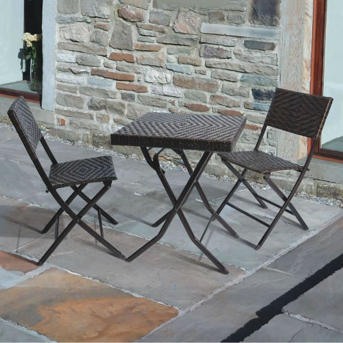 The table and chair frames are constructed from durable powder coated steel with an attractive dark brown finish. The wicker seats and table top are formed with an exceptional polyrattan weave (please see inset images for detail). The final result is lovely 3 piece set which will grace any location indoors or out. For maximum convenience the set is light and easily folded for storage or re-location.