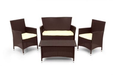 Description: Stylish and versatile weather proof 4 seater rattan suite with a sofa, two chairs and coffee table from GreatGardensOnline.Includes cream cushions (but not the scatter cushions.) This furniture is ideal for the garden or conservatory - excellent quality. The coffee table is 93cm wide, 48cm deep and 47cm tall. The sofa is 110cm wide, 50cm deep and 86cm tall. Chairs are 60cm wide, 50cm deep and 86cm tall. The cushions are approximately 5cm thick.The suite(minus the cushions)could be left outside for the summer months, but we would recommend bringing it in for the winter. Made from strong but light tubular steel frame.The cream coloured cushions and filler are polyester and flame retardent to BS standards. Supplied flat packed. Easy assembly.